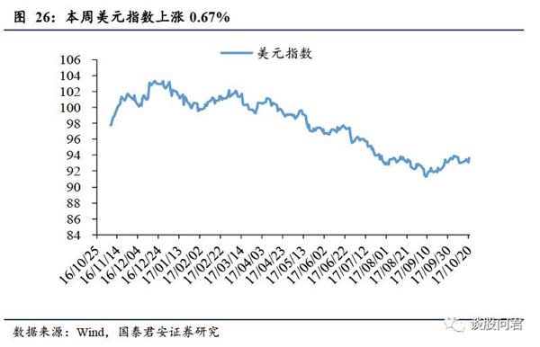 工业整体平稳,宏观经济有韧性。高炉开工率持平,发电力度下滑,螺纹钢价格下降,煤价持平。地产政策继续收紧下,商品房销售持续降温,而销售与投资间存在时滞,9月地产开发投资增速回升,此外汽车行业整体向好,宏观经济有韧性。(1)下游:地产整体销售本周环比上升,同比持续下滑,住宅类土地成交面积累计同比上升;10月车市零售走势良好;义乌小商品价格指数环比上升,电影票房环比下降;猪肉环比下跌,鸡肉、蔬菜价格环比上升。(2)中游:高炉开工率环比持平,6大发电集团日均耗煤环比下降,发电力度下降;螺纹钢价格环比下降;水泥价格和玻璃价格均上涨;(3)上游:动力煤期货价格环比上升,焦炭、焦煤期货价格环比下跌;铜、铝价格环比上升,锌价格环比下跌;海运指数BDI、BPI、BCI均环比上升。特朗普税收改革取得重大进展,市场对通货膨胀的预期提高,加上美联储继任主席很有可能是鹰派经济学家,美元指数上涨0.67%。受美元走强影响,黄金价格环比下跌1.87%。
