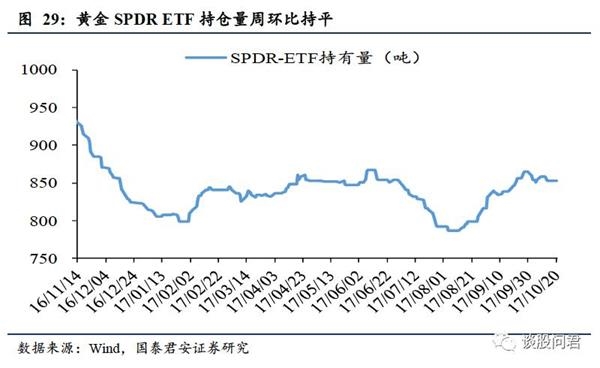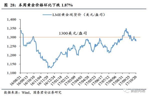 黄金价格环比下跌1.87%。黄金ETF持仓量周环比持平。特朗普税收改革取得重大进展,且继任美联储主席将很有可能是鹰派经济学家,使美元上涨。受美元走强及美朝关系缓和影响,10月20日,黄金LME现货价格报收1280.04美元/盎司,环比下跌1.87%。SPDR黄金ETF持仓量周环比持平,为853.13吨。