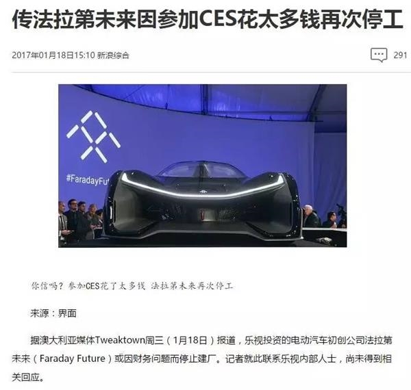 先是国内媒体转外媒的报道称:据外媒报道,乐视投资的电动汽车初创公司法拉第未来或因财务问题而停止建厂。在今年的CES上,法拉第未来发布了FF91车型,引起外界关注。新车原定于2018年上市,但现在事情是否还能够按计划发展,变得不太明朗。