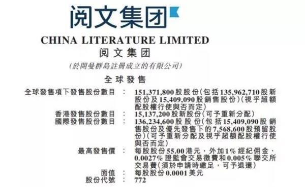 26日开始招股的阅文集团,发行价每股55港元,外加1%经纪佣金,0.0027%的证监会交易规费和0.005%联交所交易费,股票代码为00772.