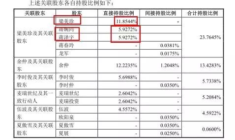 其配偶梁美珍持股11.85%,2个子女分别各持股5.93%,因其子女均未成年,其股份由梁美珍暂代管理,梁美珍实际控制持股比例约为23.7%。梁美珍与现任董事长余仲、董事左国军签署了一致行动协议,共同构成实际控制人。