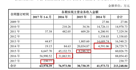 记者测算发现,当年收入中,当年签订合同比例2014-2017年分别为:11.04%、26.83%、40.36%、0.36%。其中,2016年占比明显偏多,对于2016-2017年收入确认是否存在跨期,是否提前至2016年确认收入,捷佳伟创未有明确说明。