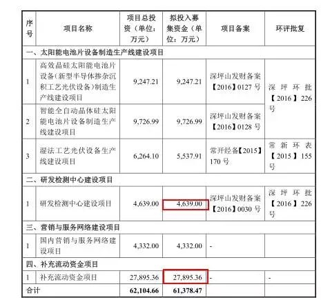 根据捷佳伟创的IPO募资计划,其共募资约6.14亿元,其中用于补充流动资金约2.8亿元,占比约45.60%,用于研发中心建设约为0.46亿元,约占7.49%。
