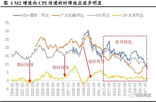 在2009年之前,广义社融增速(实体获得资金)大于M2+理财增速(银行体系的资金),此时“脱实入虚”不严重,因此M2向CPI的传递也非常顺畅,几乎没有时滞; 2009年1月至2010年4月这段时间,由于4万亿的刺激作用,广义社融增速与M2+理财同步增加,但增速开始小于M2+理财增速,在这种情况下,M2向CPI的传递即产生了大概8个月的时滞;2012年之后,广义社融增速持续地显著低于M2+理财,资金“脱实入虚”非常明显,此时M2向CPI的传递几乎完全失灵。