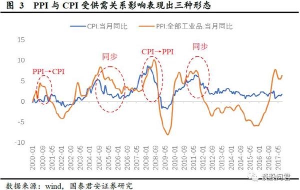 PPI与CPI都可作为通货膨胀的衡量指标,通常PPI被认为是CPI的先行指标。但不可忽视的是,这种传导会受到供需关系的影响,最终表现为三种情形:一、自上而下传导:受上游资源品价格上涨推动,下游需求不弱承接,PPI向CPI传导;二、受其他因素,协整上行:经济强劲带来实体货币资金充足,PPI与CPI同步上涨;三、自下而上传导:受下游需求推动,CPI向PPI反向传导。