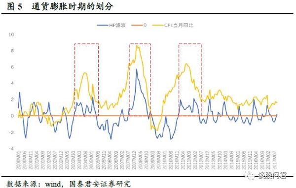 我们对以2000年为基年的CPI绝对值做HP滤波,分解出趋势值,将CPI绝对值超出趋势且持续时间较长的三个时间段作为通货膨胀时期:分别是:1)2003.11~2005.04,CPI同比突破3%,最高达5.3%;2)2007.08~2008.11,CPI同比突破6.5%,最高达8.7%;3)2011.01~2012.05,CPI同比突破4.9%,最高达6.45%。