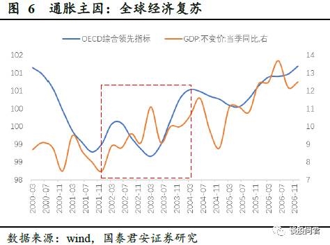 2001年末,中国加入WTO,叠加全球经济复苏,投资需求和消费需求均显著提升,直接作用于PPI和CPI,在我们划分的通胀区间2003.11-2005.04之中,CPI同比突破3%,最高达5.3%,PPI与CPI表现为同步上涨。在2002年前后,货币政策并未明显宽松,M2增速的上涨来源于外需拉动下,出口额增长所带来的外汇占款增加以及企业盈利大幅上升所带来的存款增加。