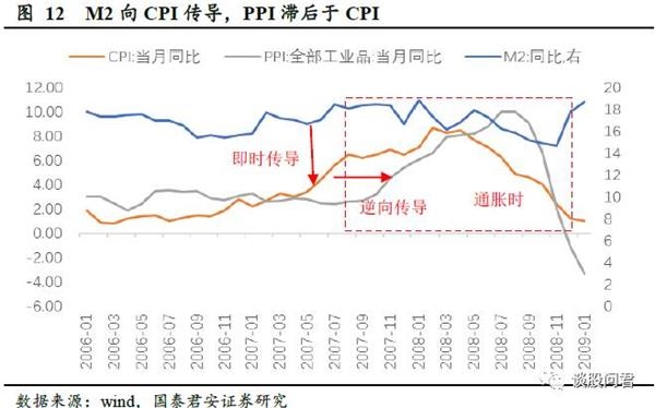 我们发现,从数据上讲,M2增速的提升无时滞地向CPI传导,CPI同比突破6.5%,最高达8.7%。但PPI不表现为CPI的先行指标,反而是CPI逆向传导到PPI.
