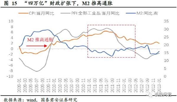通胀之前,M2增速自2009年1月开始上行,由于“四万亿”财政扩张计划,这次货币供应增速的幅度之大和速度之快是历史上罕见的,并且,广义社融增速与M2+理财增速贴合程度较高,增量资金迅速进入实体,进而引发通胀,CPI同比突破4.9%,最高达6.45%。另一方面,这段时间内PPI与CPI,两者都是由于M2与信贷扩张所推动,所以表现为同步上涨。