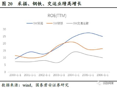 (1)2003.11~2005.04,通胀诱因是全球经济复苏,上游周期板块采掘、钢铁、以及交运相对收益较大。经济复苏时期,固定投资增速加快,采掘、钢铁等周期行业受益明显,净利润提升。交运行业受2011年底中国加入WTO、政府允许外商设立合资公司、开放跨境交通运输等承诺催化, 2003-2004货物周转量同比增加25.31%,业绩高增长。