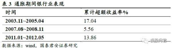 我们发现在三次通胀期间,银行业平均获得近15%的累计超额收益。主要原因在于,通胀预期增加,居民、企业存款活期化速度加快;同时投资需求增加使得银行新增贷款需求增加,两者共同推动银行业净息差增加,带动银行业股价上涨。