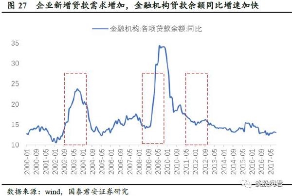 2)投资需求增加,企业贷款需求增加,金融机构贷款余额同比增速加快。具体来看,不同时间段催化因素不同,主要投资方向存在差异。2003-2005年这一时期主要催化剂在于,中国在2001年底承诺加入WTO 后一年内允许外商设立合资公司、跨境交通运输逐步开放,交通运输投资需求加快。2007-2008年,经济繁荣向上,固定资产投资稳步上升,财税体制改革刺激地方投资,地方投资增速创新高。2011-2012年 “四万亿”政策刺激基建投资固定资产投资迅速增加,带动企业新增贷款需求增加。