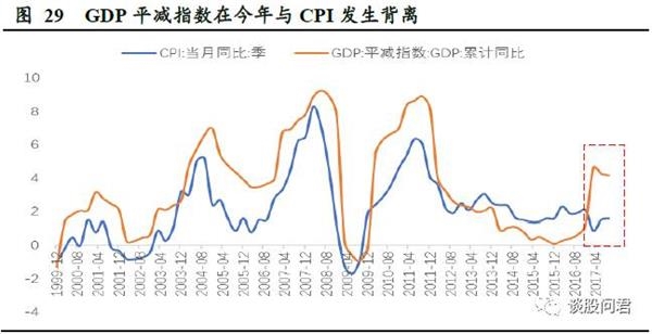 通常来说,GDP平减指数或CPI同比均可衡量通货膨胀,即使两者的具体数值在计算中存在差异,但在绝大多数时间指示的趋势却是较为一致的,但我们观察到在今年以来,GDP平减指数与CPI发生了背离,这是由于GDP平减指数实际上是CPI与PPI的一个加权结果,而PPI从2016年开始表现出与CPI的明显背离情况。通过前文分析我们大概可以总结两个原因:1、前期由于脱实向虚,大量货币主要推升了金融资产的价格;2、因为前期过剩产能并未出清,供需关系并未完全改善,因此向消费端传导乏力。