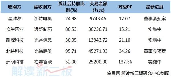 并购PE最高的是,盾安环境以15元/股受让精雷股份268万股,挂牌公司2016年净利润仅为2.42万元,对应PE11546.25倍,目前该并购案已实施完成。思坦仪器整体估值8亿元嫁入海默科技对应PE仅9.46倍,最低,目前处于董事会预案阶段。