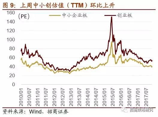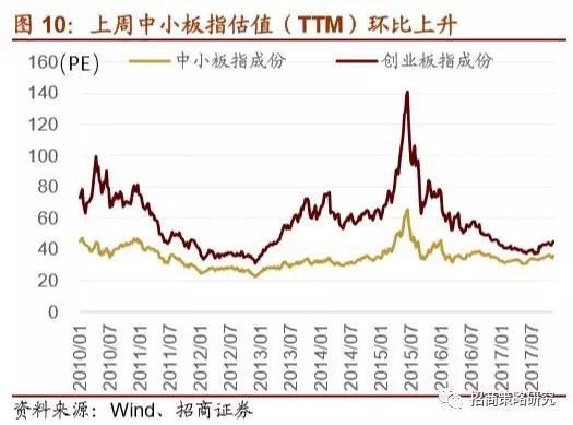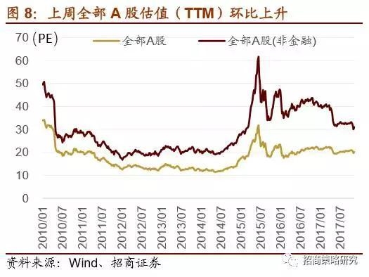 估值方面,上周全部A股估值(TTM)环比上升,从19.76上升至20.21,剔除金融后全部A股估值从30.13上升至30.99,中小板估值从38.92上升至40.16,创业板估值从51.84上升至53.67。沪深300与中证500成分股整体估值上升。