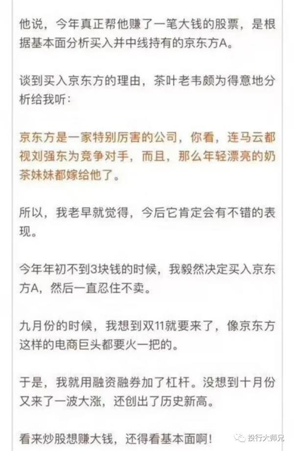 其中一件是,股民“茶叶老韦”买京东方A(SZ.000725)上赚了一笔大钱,于是他兴奋而又深情地总结了自己炒股心得,一下子传遍了朋友圈: