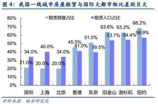 就算是租赁市场最为发达的一线城市,目前而言与其他国际大都市相比差距也巨大。根据链家研究院的数据,目前北京、上海、深圳的租赁房屋占比分别为20%、20%、21%,租赁人口占比分别为34%、40%、34%,与纽约、洛杉矶、旧金山等国际大都市超过60%的租赁房屋占比和超过50%的租赁人口占比相比,仍有较大发展空间。