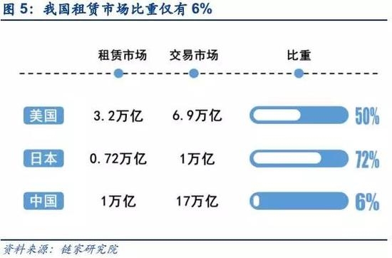 从全国的住房租赁市场发展来看,我国的租赁市场占整个房地产交易市场的比重仅为6%,远低于美国的50%和日本的72%。同时租赁市场仍不成熟,全国机构化渗透率只有2%,北京作为一线城市中机构化渗透率最高的城市,也才不到5%,相比之下美国机构化渗透率在30%左右,日本的渗透率达到80%以上,在市场成熟度上领先我国很多。