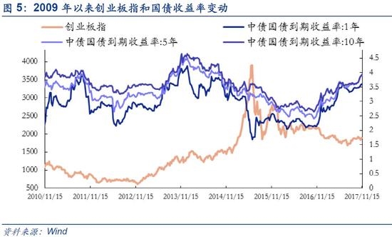 2017年创业板盈利同比回落,环比基本趋稳,利率上行影响或推动其震荡走低。利率上行对于具有良好业绩支撑的A股整体市场而言影响较小。然而,对于企业盈利状况改善有限的创业板而言,分子端EPS的增长情况不足以抵消分母端利率上升的负面影响,行情表现一定程度受利率上升拖累。自2016Q4起,伴随着国债1年期、5年期和10年期到期收益率分别从2.1%、2.5%和2.7%左右升至3.6%、3.9%和4.0%左右的近三年高位,同,2017年创业板(剔除温氏股份和乐视网)单季度同比盈利水平较2016年出现明显下滑,环比维持20%左右,指数从2200点左右一路跌破1700点,近期仍保持1900点左右低位震荡状态。
