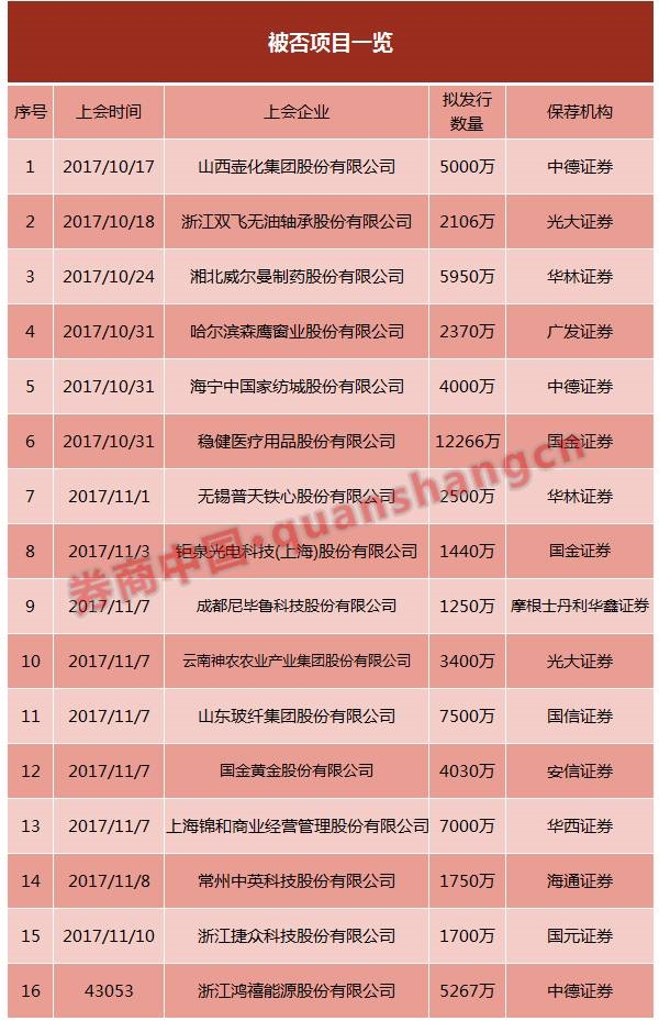 券商中国记得统计被否的这16家企业的保荐机构发现,中德证券最惨,其保荐的3个项目均被否,华林证券、光大证券、国金证券也均有2个项目折戟而归。