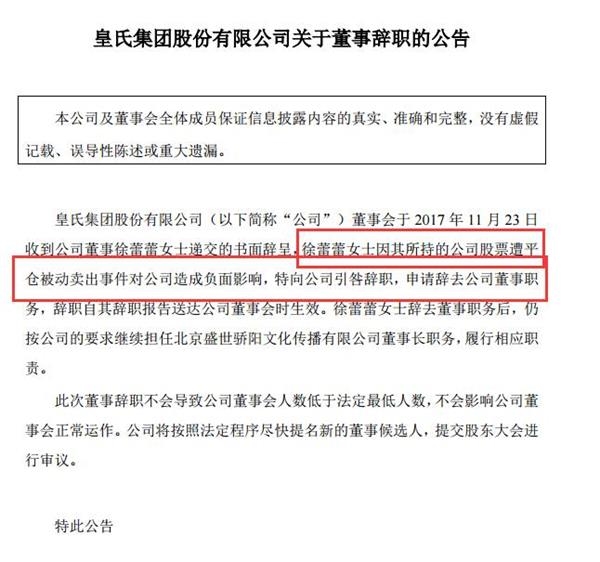 随后,皇氏集团23日晚间又公告,公司董事徐蕾蕾辞职了。徐蕾蕾表示因其所持的公司股票遭平仓被动卖出事件对公司造成负面影响,特向公司引咎辞职,申请辞去公司董事职务,辞职自其辞职报告送达公司董事会时生效。徐蕾蕾女士辞去董事职务后,仍按公司的要求继续担任北京盛世骄阳文化传播有限公司董事长职务。