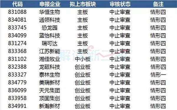 13家中止审查的挂牌企业中,除泰林生物是因情形一中止,其余12家均因情形四中止。