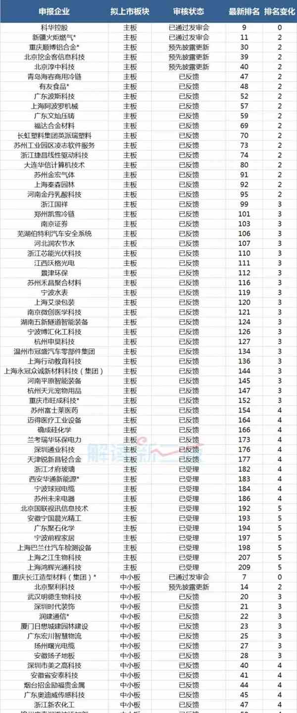 4家排队企业已通过发审会:科华控股、新疆火炬、长江材料、百华悦邦;2家暂缓表决:春晖智控、奥飞数据;8家预披露更新:顺博合金、挖金客、淳中科技、聚利科技、新产业、指南针、苏州宇邦新型材料、捷佳伟创。另外,87家已获证监会反馈、38家获证监会受理。
