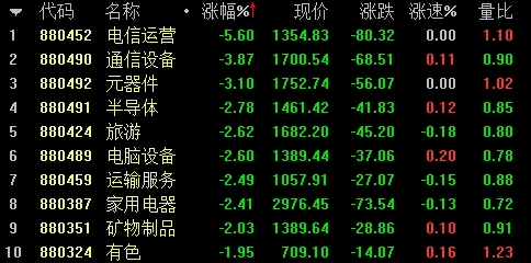 昨日,沪指继续低开低走,收盘下跌0.94%,报收3322.23点;深证成指走势更弱,重挫1.92%,惨遭四连跌,报收10954.18点。电信运用板块跌幅最大,下跌5.6%,元器件、半导体、家用电器、电脑设备等板块跌幅居前。