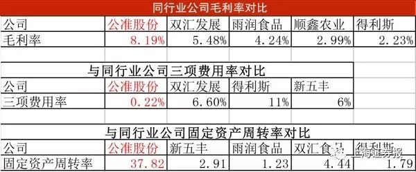 再看三费(销售费用、管理费用、财务费用),公司同样“技高一筹”。公准股份2014年的三项费用率为0.62%,2015年降为0.3%,2016年仅为0.22%。而上市公司同行中,得利斯的三项费用率稳定在11%以上,双汇发展稳定在6.6%以上,新五丰则在6%以上。