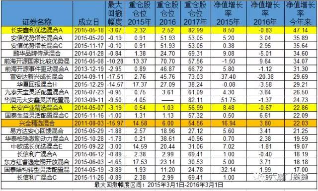 还有一类混合型基金,它们选择了在2015年整年保持极低的仓位,在2017年加大仓位。