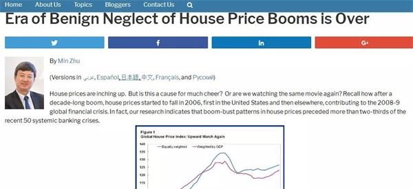 IMF副总裁朱民在国际货币基金组织官方博客上撰文认为,一些楼市过热国家必须对房价涨势严加监控,并用货币金融手段抑制房价泡沫的累积。