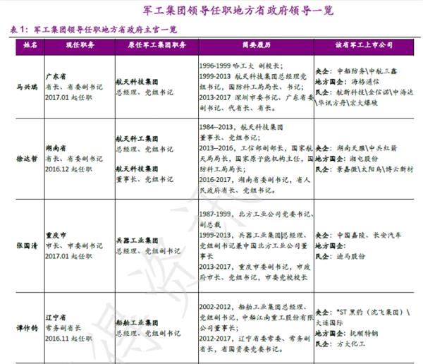 近2年来一大批军工系统领导出任地方省一级政府党政主官:2015年,来自航天、兵器、船舶等军工央企领域的6位央企领导陆续履任地方省一级政府党政主官(广东、湖南、重庆、浙江、辽宁),是近年来地方政府领导岗位任命出现的少有现象。再考虑2012年起履任河北省省长的张庆伟,已有7位省级领导出身自军工系统。