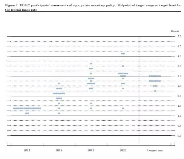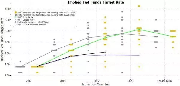 同时,会后还公布了体现美联储官员预测未来利率变化的点阵图。它显示,美联储预计2018年将加息三次,明年加息三次。到2020年末,联邦基金利率将升至3.1%。