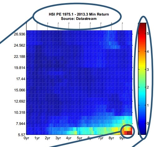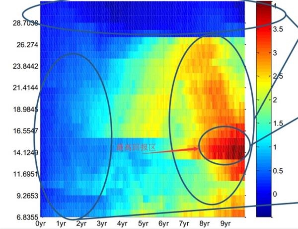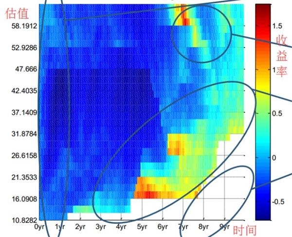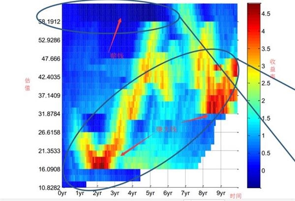 先介绍一下如何看这个图,右侧的彩条是回报率,如1表示一倍的回报率,那么红色就代表5倍以上的回报率,所以看到这个图的时候,可以先找黄色到红色的色块,它代表了高收益率。横轴很明显是年限,竖轴是PE,市盈率。