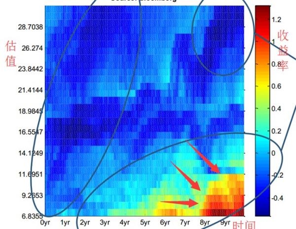 从红色区域部分可以看出来,当买入股票时候的估值比较低的时候,取得红色部分高收益所需要等待的时间比较短(横轴长度),而相反,赚不到钱的时候,基本都是买的贵的时候。