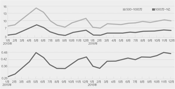 比较2015年6月末和2016年12月末的数据不难发现,持股市值在50万~ 100万元的持有人数量由213.30万户降至179.17万户,降幅为16%;持股市值在100万~500万元的持有人数量由155.43万户降至119.53万户,降幅为23.09%;持股市值在500万~1000万元的持有人数量由13.39万户降至9.78万户,降幅为26.94%;而持股市值在1000万~1亿元的持有人数量由7.14万户降至5.90万户,降幅为17.42%。