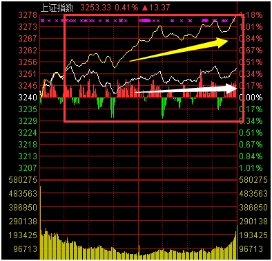 (黄线持续攀升,白线横向震荡,表明流通盘较小的股票涨幅较大)