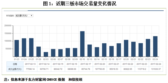 从新三板市场交易情况来看,进入2017年以来,新三板市场1月份日交易额多维持在8-10亿左右,市场指数表现相对平稳。2月份中旬前期以来,新三板交易量萎缩非常明显,且减少幅度较大,出现4亿左右的日成交量。但进入下旬,新三板市场交投略活跃,2月23、24连续成交回升到10亿元上方,显示市场有相对活跃迹象。