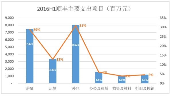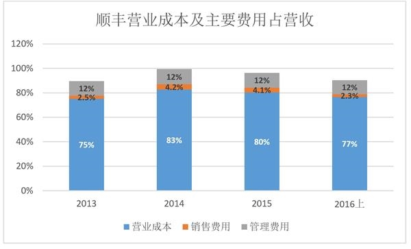 2016年上半年,顺丰各项成本、费用占营收的90%。