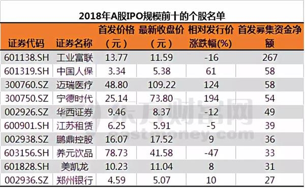 从融资规模来看,2018年A股集资额前五名的公司分别是工业富联(267亿元)、中国人保(58亿元)、迈瑞医疗(58亿元)、宁德时代(54亿元)以及华西证券(49亿元)。