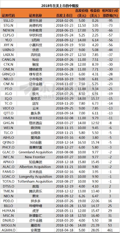 同样地,随着美股大盘走低,2018年在美国上市的44只中概股中,有33只股票较发行价下跌,破发率高达75%。其中,盛世乐居的跌幅最大,达到95%,该股于2018年2月5日在美国纳斯达克上市,首发价格为5美元,但截至2018年最后一个交易日收盘,该股已跌至0.26美元。
