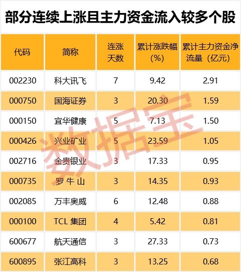 值得注意的是,280只连续上涨个股中,4只个股期间主力资金累计净流入超过亿元。其中,累计资金流入最多的为科大讯飞,主力资金累计流入2.91亿元。