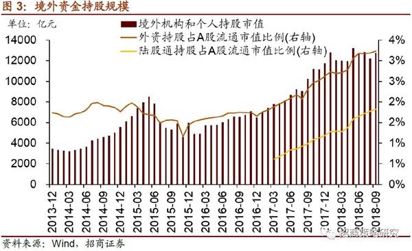 外资持股占比持续攀升。截至2018年9月末,境外机构和个人持股规模达12784.87亿元,占同期A股自由流通股市值的比例为6.73%,较年初的5.16%提升不止1.5个百分点;其中,通过陆股通持股约占外资持股总规模的56.2%。