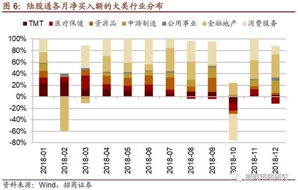 消费服务成为配比降幅最高的大类行业,配置比例震荡下降,占比全年累计下调4.56%;TMT行业的配比呈现持续下滑状态,全年下降3.08%;陆股通对医疗保健行业的配置比例先上升后下降,在5月达到最大值(12.1%)后持续下降,全年累计降低1%。