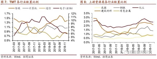 行业配比方面,2018年金融地产类行业配比增幅最大(+4.52%),银行、非银和房地产占比全面提升。资源品类占比增加2.37%,其中建筑材料是增幅的主要来源(1.05%)。中游制造业提高1.71%,其中机械设备提高0.85%。消费服务配比降幅最高(-4.56%),源于家电占比的大幅下降。受电子行业占比大幅下降(-3.58%)影响,TMT行业配比持续下滑 (-3.08%)。医药配比全年下降1%。