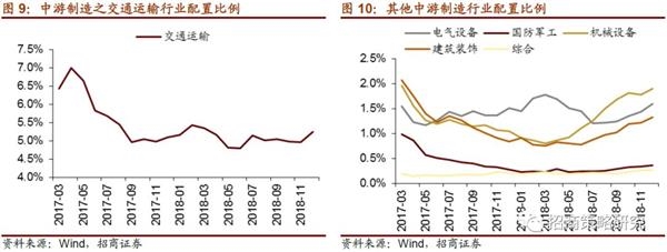 中游制造业中,各一级行业占比基本不同幅度提升。机械设备占比已连续9个月提升或持平,12月上升0.1%;占比最高的交通运输行业占比上升0.3%至5.2%,电气设备占比小幅上升0.2%至1.6%,建筑装饰占比小幅上升0.1%至1.3%,国防军工占比与前期持平。