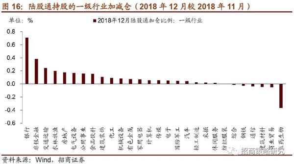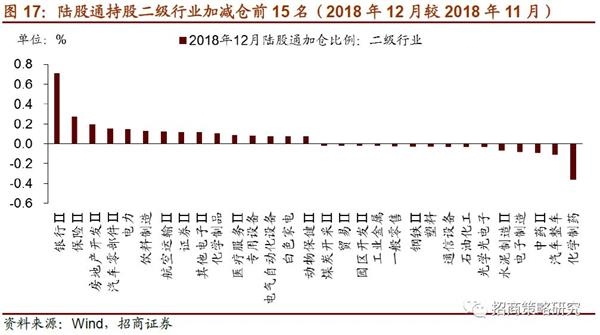 陆股通调仓方面,按照申万一级行业分类,2018年12月有22个行业加仓,6个行业减仓。具体地,加仓幅度最大的为银行业,加仓0.71%;其他加仓行业主要包括非银金融、交通运输,加仓比例分别为0.37%、0.24%,其次为农林牧渔、房地产、电气设备、公共事业、食品饮料等,加仓比例均不低于0.15%。减仓幅度较高的为医药生物,减仓比例为0.37%,商业贸易减仓0.05%,其他小幅减仓行业包括综合、钢铁、通信、建筑材料等,减仓比例均不超过0.05%。
