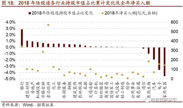 2018年全年,陆股通持股的各行业市值占比中,银行占比增幅最高,其他增幅较高的行业包括建筑材料、房地产、机械设备等;家电、电子等行业占比大幅降低,其他降幅较高的包括汽车和医药生物。