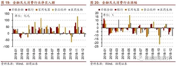 从陆股通净流入额的行业分布来看,2018年食品饮料行业净买入规模最高,累计达569亿元;其次为银行和非银等金融行业,分别买入346亿元和287亿元。医药和家电分别净买入185和145亿元;电子净买入157亿元。由此来看,家电、电子、医药等行业市值占比在2018年的大幅下降一定程度是由于行业下调对应资产价值缩水进而占比下降。