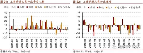 从上游资源品类行业来看,总体加仓规模相对不高,但在钢铁、建材等行业涨幅突出的月份,对应股票的加仓规模明显提升。例如,6月和7月钢铁行业涨幅在各行业的市场表现中高居榜首,陆股通在这两个月对钢铁行业的净买入均有所增加,且净买入额在所有行业中排名靠前;11月钢铁大幅回调,陆股通相应减仓。7月建筑材料大涨且在各一级行业中涨幅排第二,当月北上资金对建筑材料行业股票的净买入额也相应提升,在各行业中属于买入额较高的行业。化工中的二级行业石油化工在4月、7~9月涨幅居前,陆股通加仓,化工行业净买入增加。